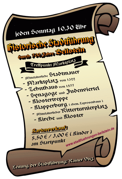 Bitte beachten Sie: Diese sozialgeschichtliche Stadtführung wird in Beilstein ausschließlich von mir, Rainer Vitz angeboten. Diverse Busfahrer, externe Reiseleiter usw. bieten zum Teil Ortsbegehungen in einer bedenklichen Qualität und Standard an, an denen ich mich gerne messen lasse – die Sie bitte aber unter keinen Umständen mit meiner Stadtführung verwechseln sollten. Meine Bitte: Buchen Sie beim „Original“ und Verfasser der nun folgenden historischen Seiten und lassen sie sich von Qualität überzeugen!